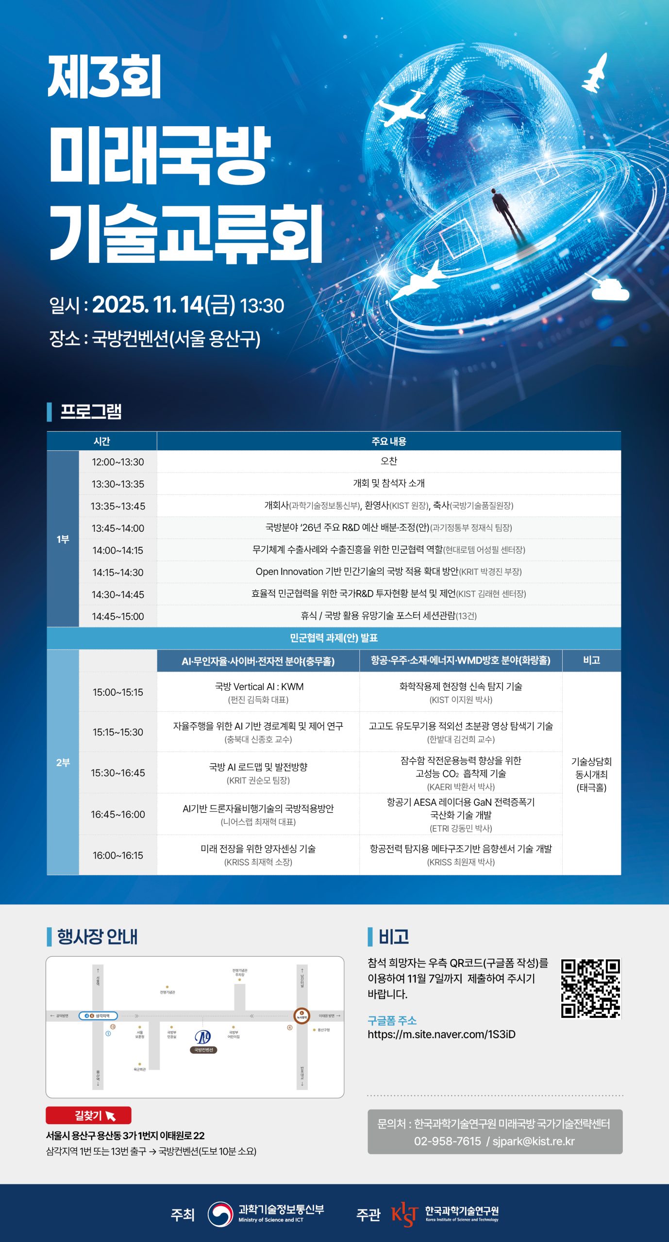 미래국방 국가기술전략센터에서는 과학기술정보통신부 주최, KIST 주관의 제3회 미래국방 기술교류회를 개최하여 국방적용 가능한 민간 보유기술을 소개하고 국방분야와 연계하는 교류의 장을 마련하였으며, 이에 정출연, 군 및 관련기관의 관심있는 분들을 기술교류회에 초청하오니 많은 관심 및 참석바랍니다!