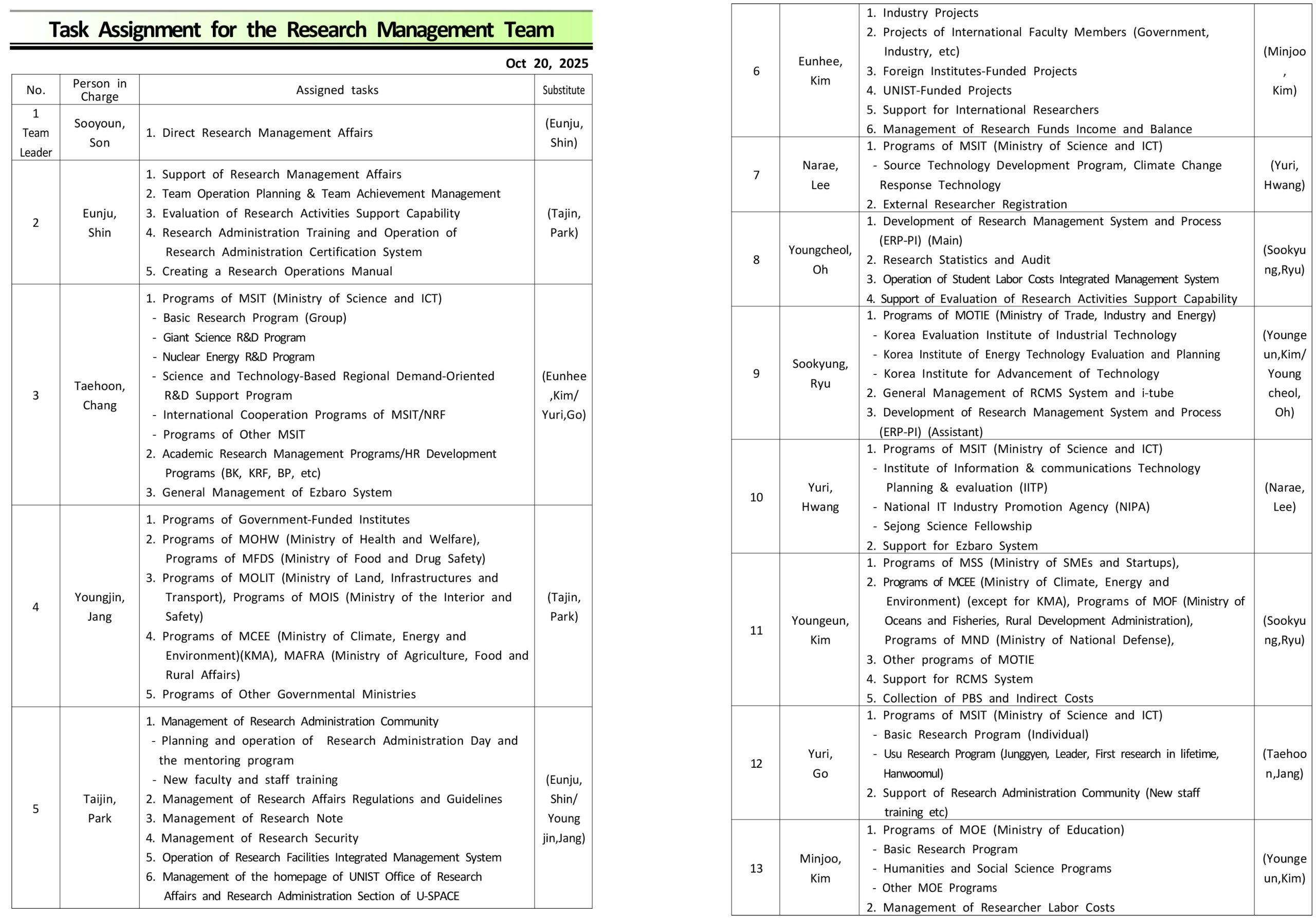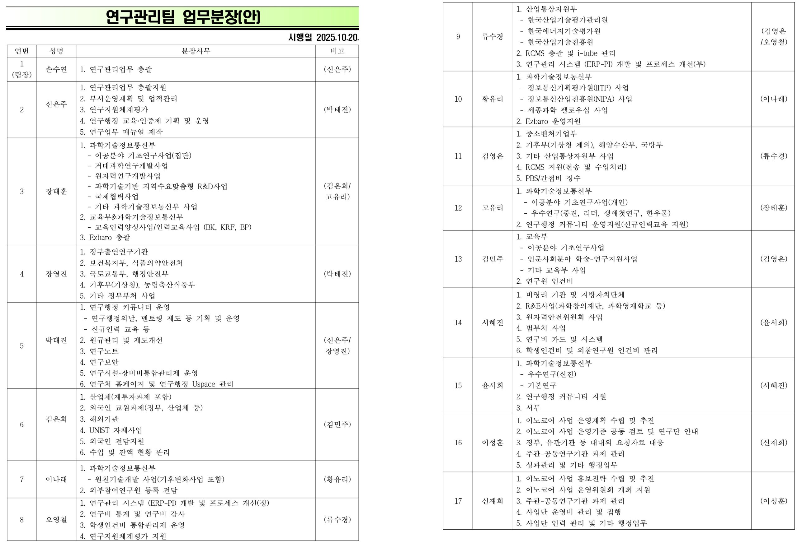 home 자료마당 공지사항 일반공지 일반공지 print 연구처 연구관리팀 업무분장 안내 (2025.10.20.시행) | Announcement of Segregation of Duties in the Research Management Team Oct 21. 2025 15조회 Download -Announcement-of-Segregation-of-Duties-in-the-Research-Management-Team.pdf 2025.10.20-연구관리팀-업무분장.pdf Oct-20-2025-Task-Assignment-for-Research-Management-Team.pdf prev 2025년 제2회 연구행정 전문가 양성과정 교육 안내(10.29~10.31) next 글이 없습니다. 목 록