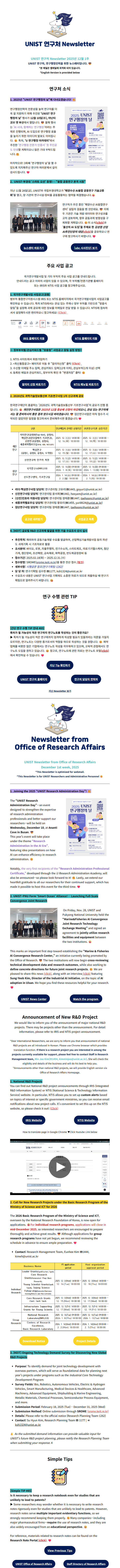 home 자료마당 공지사항 뉴스레터 뉴스레터 print 2025년 12월 1주 UNIST 연구처 Newsletter Dec 05. 2025 30조회 prev 2025년 11월 4주 UNIST 연구처 Newsletter next 글이 없습니다. 목 록