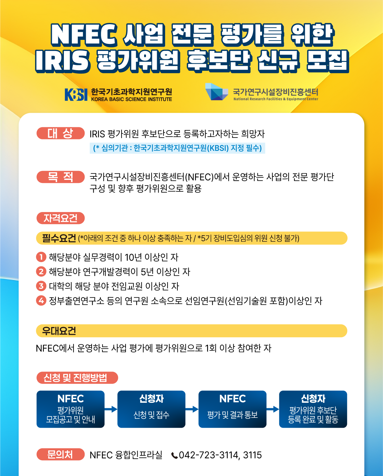 home 자료마당 공지사항 일반공지 일반공지 print NFEC 사업 전문 평가를 위한 IRIS 평가위원 후보단 신규 모집 Dec 01. 2025 9조회 prev 연구기획팀 업무분장 안내(2025.11.24. 시행) next 글이 없습니다. 목 록