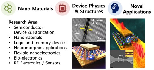 저희는 나노물질, 로직 및 메모리 소자, 뉴로모픽 응용, 유연소자, 바이오 소자, RF 소자와 관련된 기초 응용 연구를 진행하고 있으며, 나노소자 및 나노기술을 활용하여 새로운 패러다임의 발견, 이해, 그리고 응용을 통해 사회적 요구에 맞는 새로운 유비쿼터스 시스템을 구현하고자 합니다.