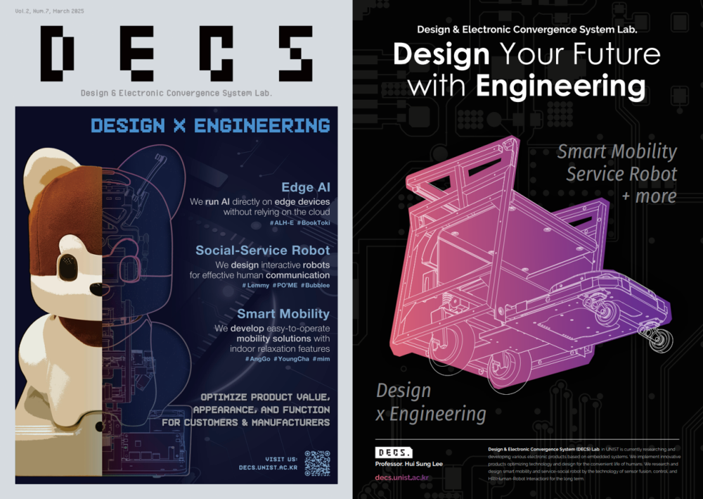 Design & Electronic Convergence System Lab creates novel sensing and interface technologies that foster powerful and delightful interactions between humans and robots/machines. This research often lies in emerging use modalities, such as touch, gestural, voice, and emotional interaction. These technologies are applied and deployed to smart mobilities, future vehicles or social robots using On-Device AI. Students can consider design factors and learn a wide range of electronic engineering skills necessary for product development. Any function required for the product can be developed with the optimum utilization of electrical or electronic elements.