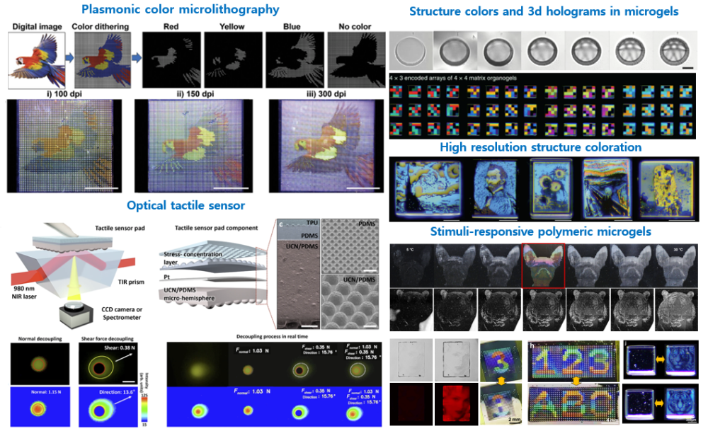 정밀 3D 미세구조를 광학적으로 제작하고, 이를 촉각 센서 시스템과 3D 전방위 시차(full-parallax) 홀로그램 패턴 제작에 적용합니다. 우리 연구실의 연구 범위는 기능성 공액고분자 합성, 유무기 하이브리드 재료 합성, 미세유체 채널 제작을 위한 연성 리소그래피, 3D/4D 프린팅, 3D 홀로그래피, 구조색 시스템 개발에 걸쳐 있습니다. 또한 외부 자극(예: pH, 기계적 변형, 습도, 휘발성 유기화합물, 유해 가스 등)에 반응해 색이 변하는 유기 소재와 공액고분자를 설계·합성하여, 신경작용제를 신속·정확하게 탐지하는 화생방(CBRN) 센서 기술 개발 연구도 활발히 진행하고 있습니다. 이러한 역량을 바탕으로, 맞춤형 광학 특성을 지닌 유무기 기능성 나노재료를 설계·합성하고 3차원 미세유체 채널을 이용해 전례 없는 광학 응답을 보이는 미세구조를 연속적으로 제조함으로써 위변조 방지 시스템을 개발하고 있습니다.