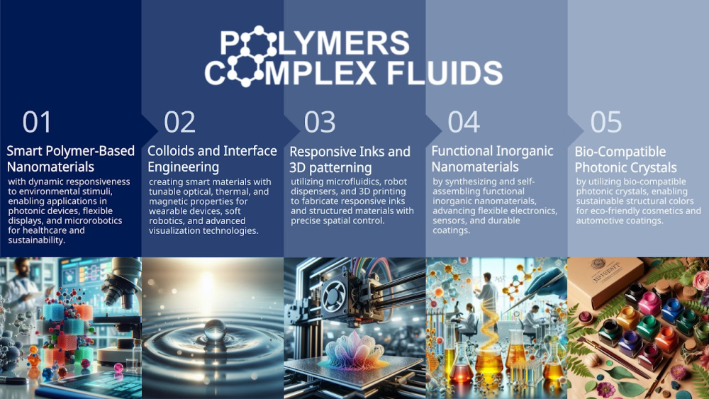 친환경고분자, 콜로이드, 액정엘라스토머, 3D프린터, 마이크로로봇, 센서, 광감응성스마트소재, 탄소복합재료