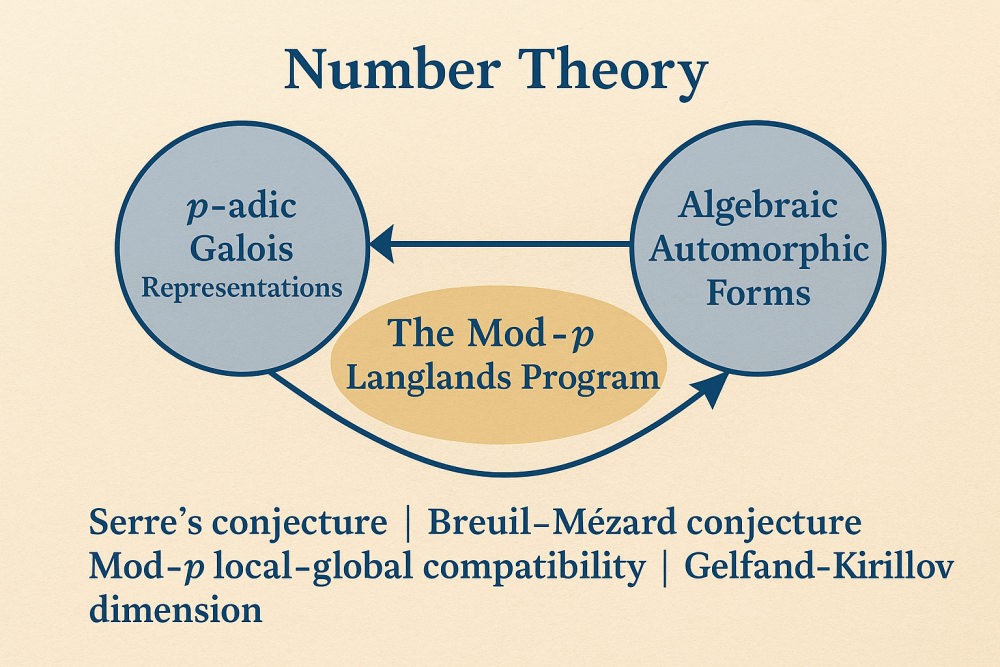 My research lies in number theory, with a focus on p-adic Galois representations and automorphic forms. Broadly speaking, I study how deep symmetries in arithmetic can be described through linear algebra. A central theme of my work is the emerging mod-p Langlands program, which seeks to connect two worlds: algebraic objects called Galois representations and analytic objects called automorphic representations, after reducing them modulo a prime number p. While this correspondence is fully understood only in one case—G_2(Q_p)—many questions remain open in more general settings. My projects aim to shed light on these questions by analyzing candidates for such correspondences, with a focus on phenomena such as the weight part of Serre’s conjecture, the Breuil–Mézard conjecture, mod-p local–global compatibility, and the Gelfand–Kirillov dimension. In this way, my work provides new evidence and tools for advancing the mod-p Langlands program.