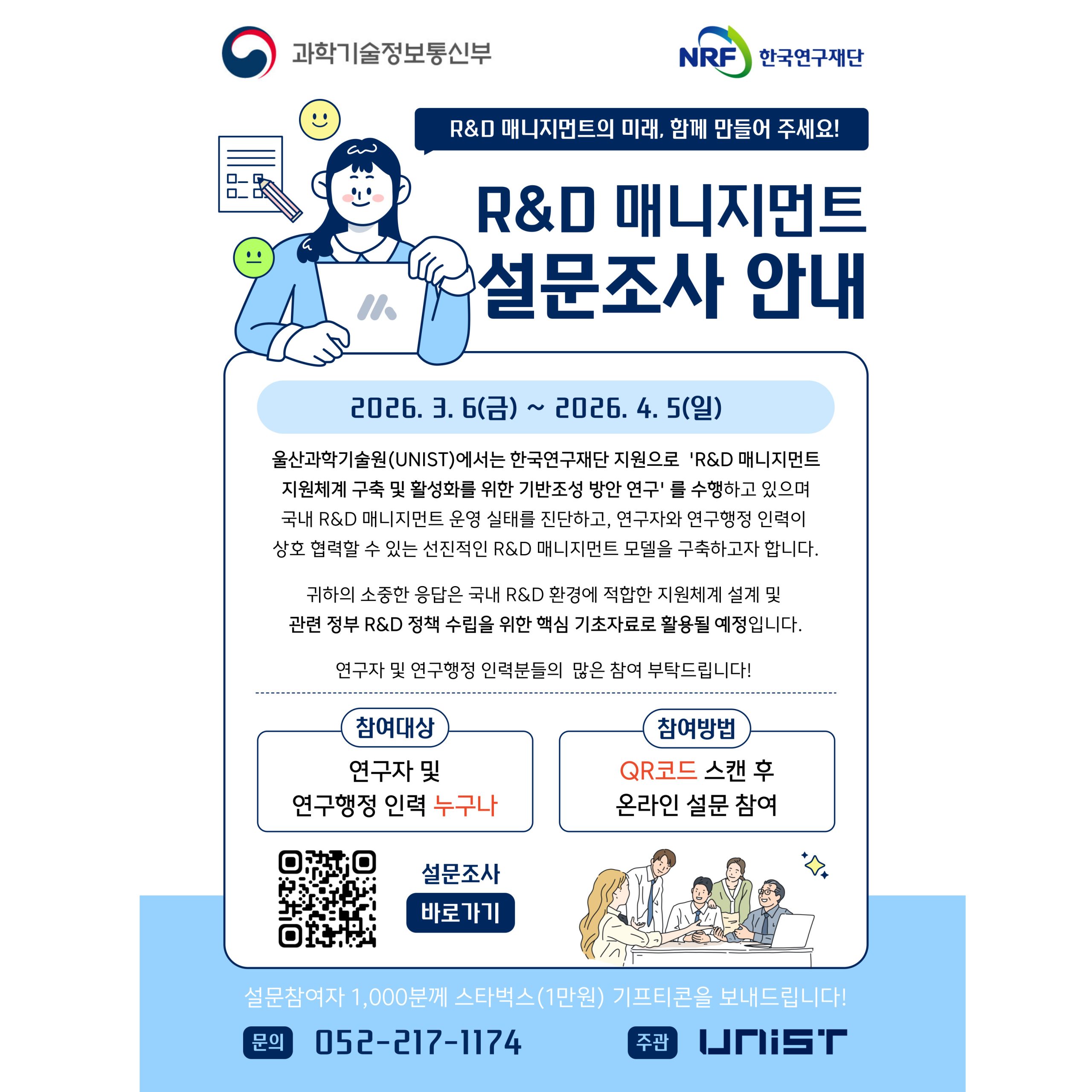 The Research Planning Team is carrying out the project titled “A Study on Establishing and Activating the Foundation for an R&D Management Support System,” supported by the National Research Foundation of Korea. To understand the current status and perceptions of R&D management in Korea, a survey will be conducted as outlined below, targeting researchers and research support staff. Please note that this survey will be conducted in Korean. We kindly ask for your understanding.
